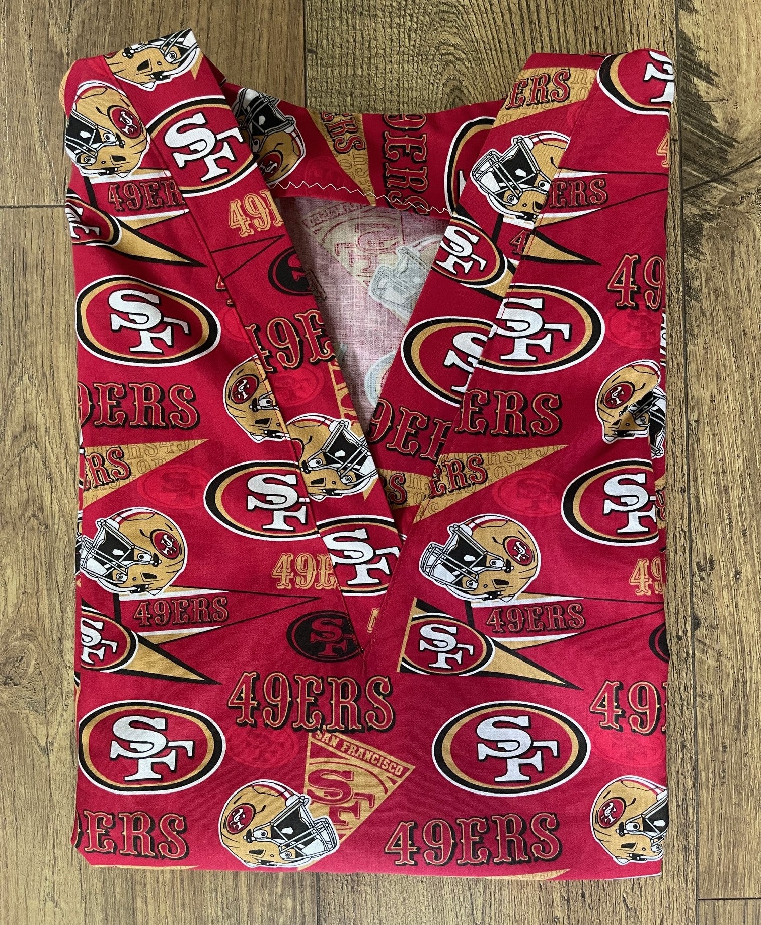 Medical Scrub shirt is handmade from 100% cotton, a relaxed fit, not fitted, V-neck, short sleeved with choice of 2 roomy double stitched front pockets OR 1 Chest Pocket with hip side slits for extra hip ease or the No Slits Option. All seams have zigzag edges to prevent fraying. I suggest machine wash cold, hang dry, light ironing maybe required. Will shrink if washed in hot water and placed in dryer.