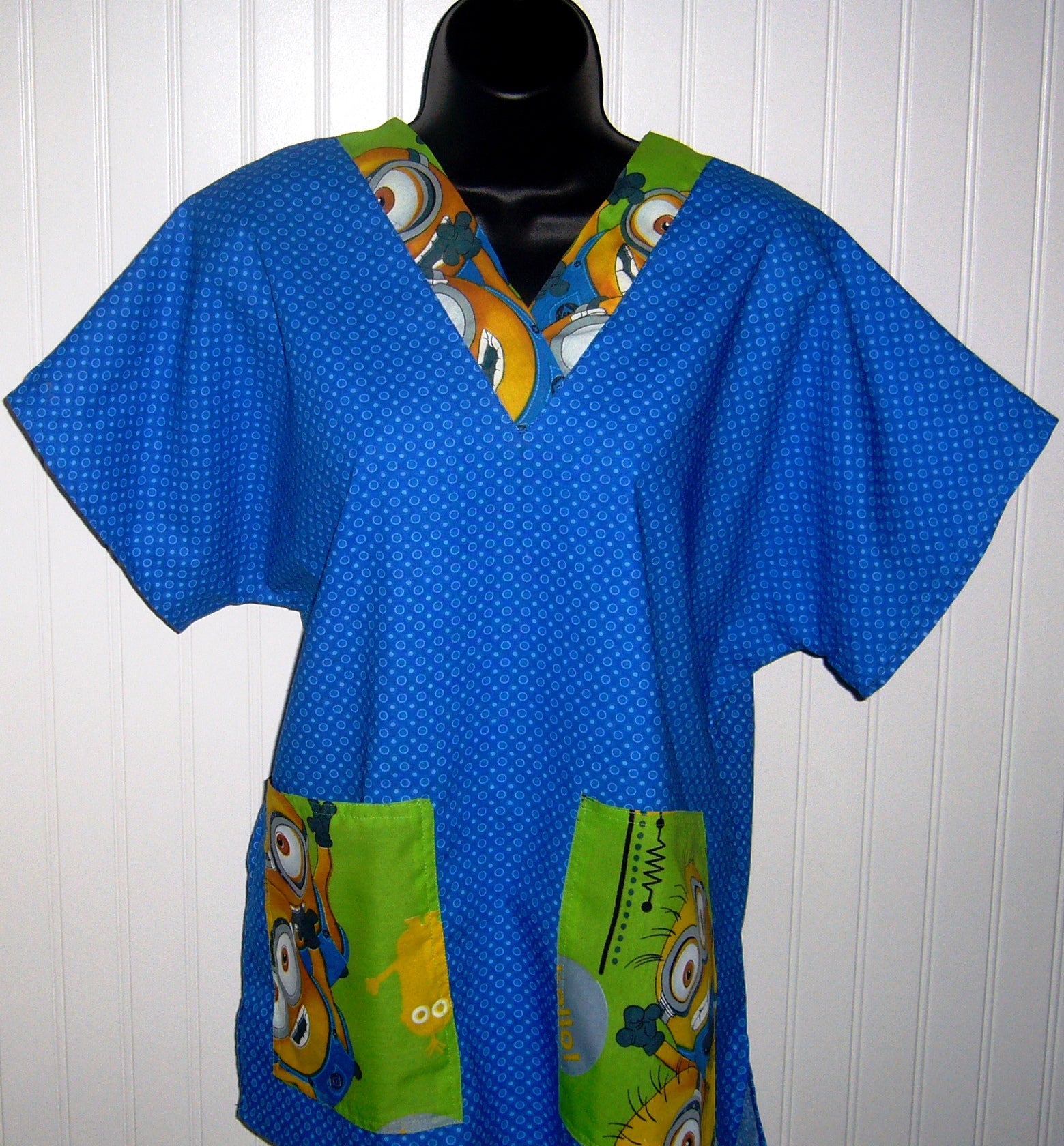 This Medical Scrub shirt is handmade from 100% cotton, a relaxed fit, not fitted, V-neck, short sleeved with 2 roomy double stitched front pockets with hip side slits for extra hip ease. All seams have zigzag edges to prevent fraying. I suggest machine wash cold, hang dry, light ironing maybe required. Will shrink if washed in hot water and placed in dryer.