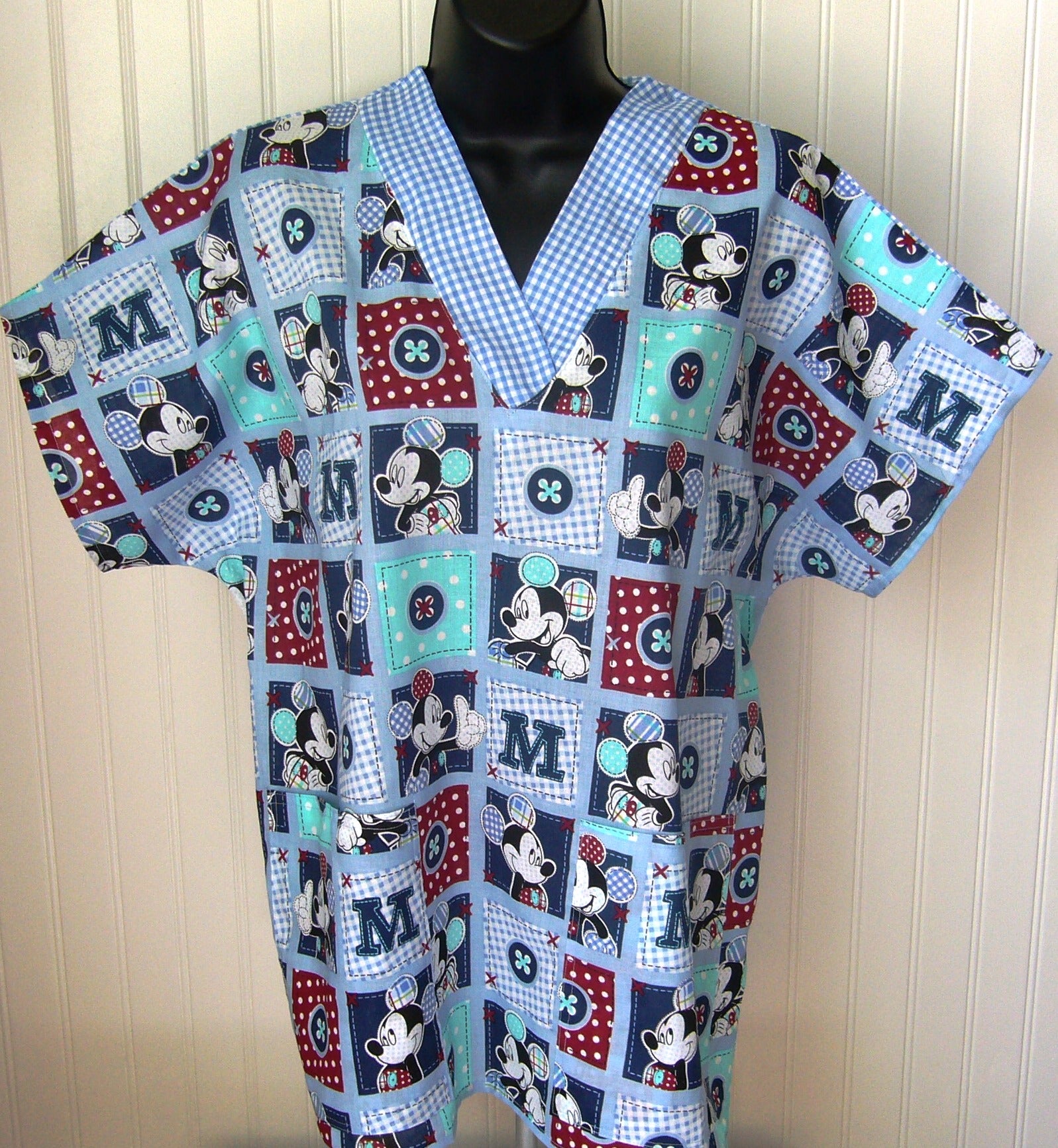 This Medical Scrub shirt is handmade from 100% cotton, a relaxed fit, not fitted, V-neck, short sleeved with 2 pockets with hip side slits for extra hip ease. All seams have zigzag edges to prevent fraying. I suggest machine wash cold, hang dry, light ironing maybe required. Will shrink if washed in hot water and placed in dryer.