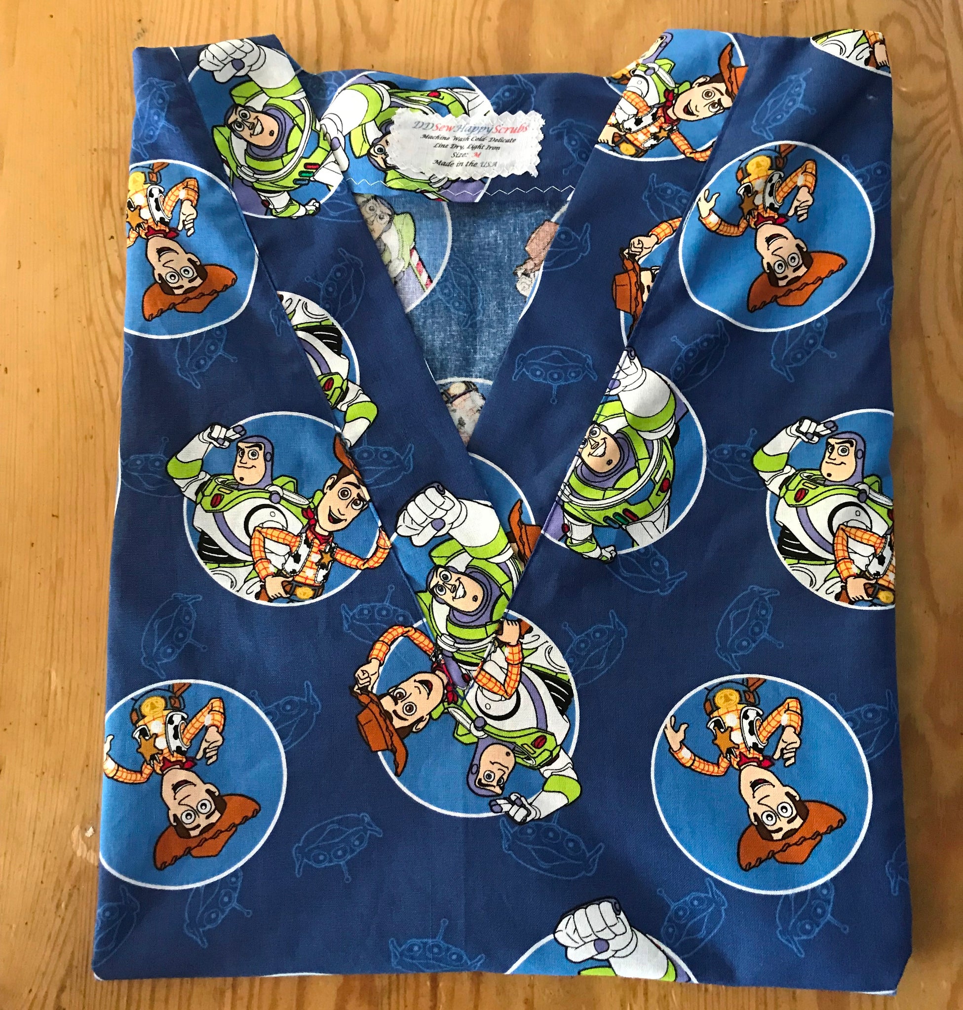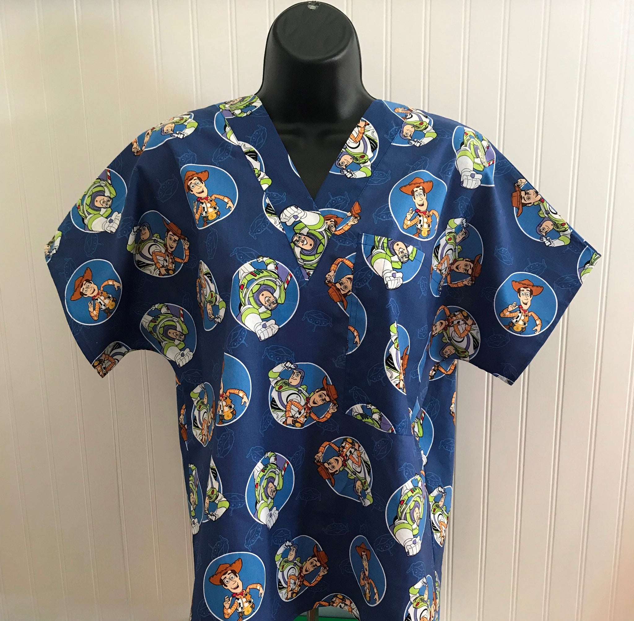 This Medical Scrub shirt is handmade from 100% cotton, a relaxed fit, not fitted, V-neck, short sleeved with No pockets with hip side slits for extra hip ease. All seams have zigzag edges to prevent fraying. I suggest machine wash cold, hang dry, light ironing maybe required. Will shrink if washed in hot water and placed in dryer.