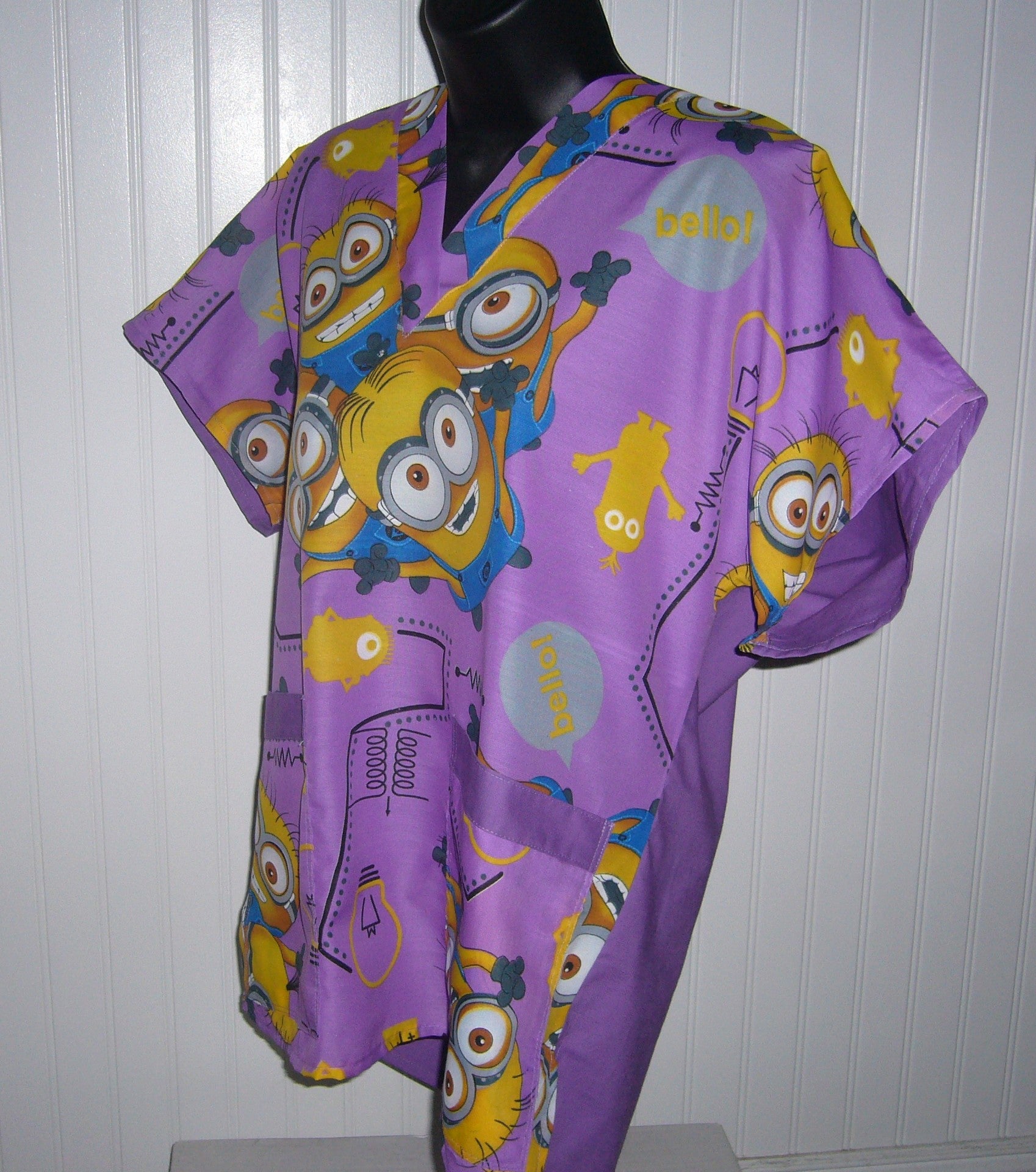 This Medical Scrub shirt is handmade from 100% cotton, a relaxed fit, not fitted, V-neck, short sleeved with 2 roomy double stitched front pockets with hip side slits for extra hip ease.