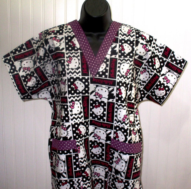 This Medical Scrub shirt has Minions front with black back and collar band is handmade from 100% cotton, a relaxed fit, not fitted, V-neck, short sleeved with 2 roomy double stitched front pockets with hip side slits for extra hip ease. All seams have zigzag edges to prevent fraying. I suggest machine wash cold, hang dry, light ironing maybe required. Will shrink if washed in hot water and placed in dryer.