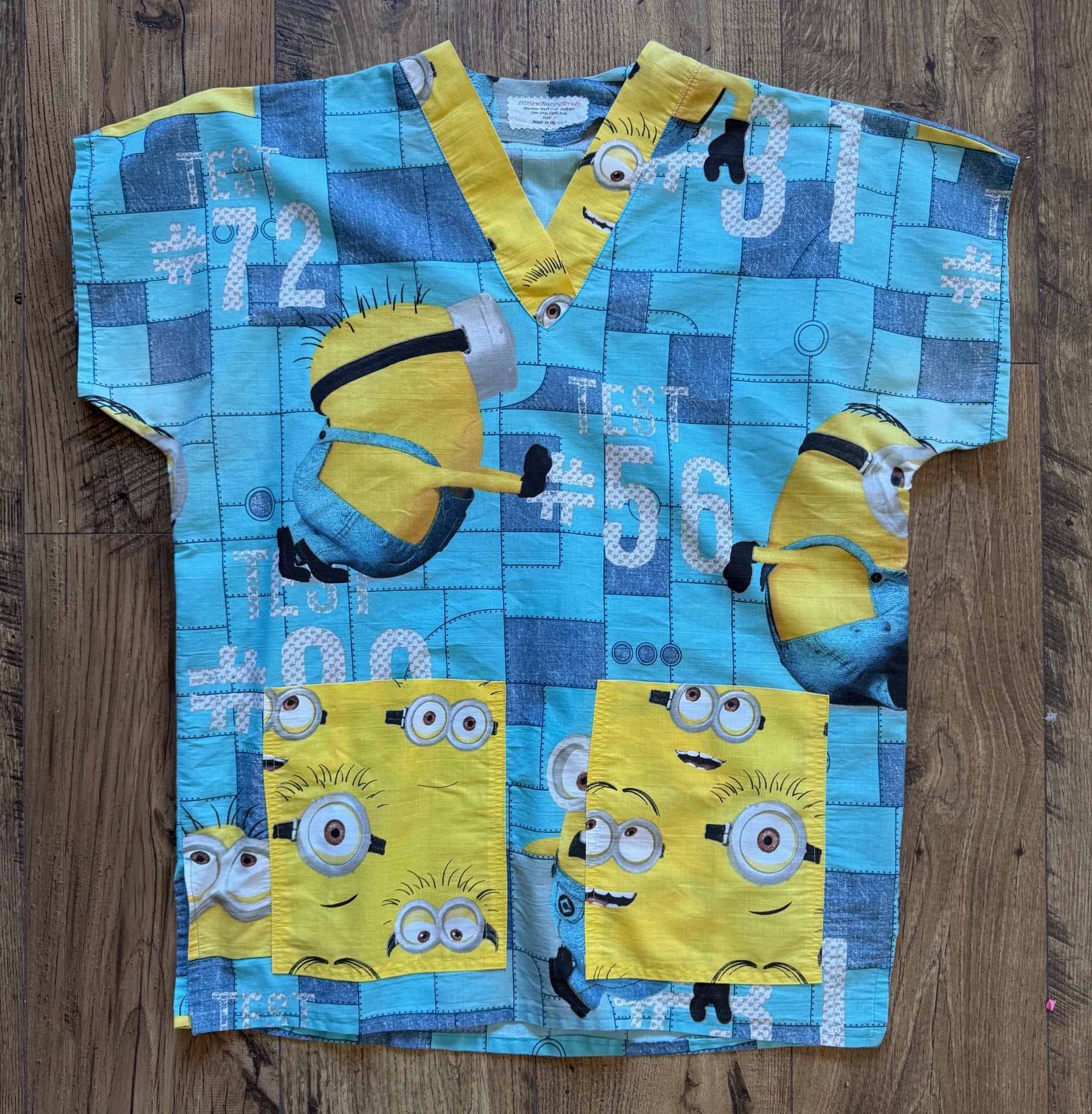 This Medical Scrub shirt has Minions cow skin fabric with Minions purple pockets and band handmade from 100% cotton, a relaxed fit, not fitted, V-neck, short sleeved with 2 roomy double stitched front pockets with hip side slits for extra hip ease. All seams have zigzag edges to prevent fraying. I suggest machine wash cold, hang dry, light ironing maybe required. Will shrink if washed in hot water and placed in dryer.