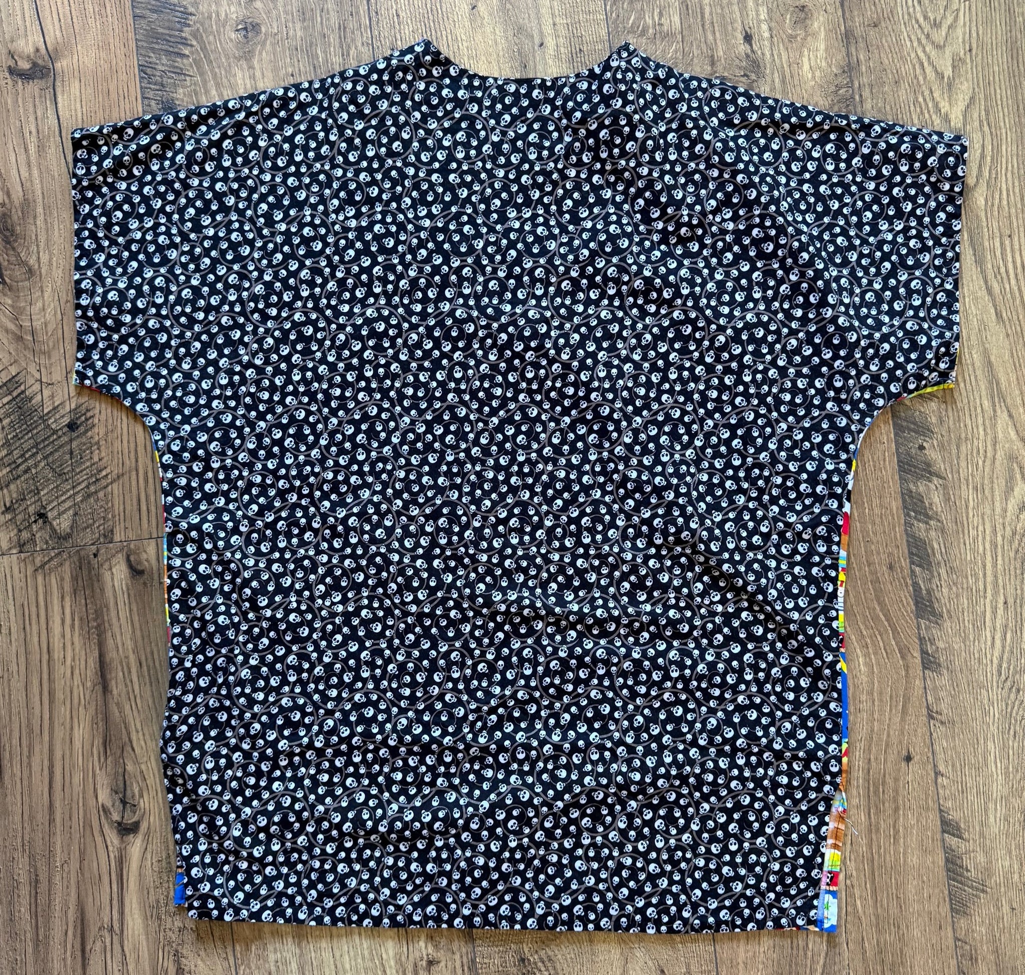 This Medical Scrub shirt has Pirates front fabric with tiny skulls back is handmade from 100% cotton, a relaxed fit, not fitted, V-neck, short sleeved with 2 roomy double stitched front pockets with hip side slits for extra hip ease. All seams have zigzag edges to prevent fraying. I suggest machine wash cold, hang dry, light ironing maybe required. Will shrink if washed in hot water and placed in dryer.